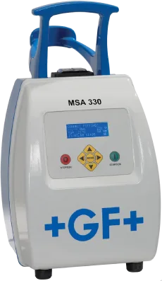 A unidade de eletrofusão MSA 330 combina alto desempenho em juntas com manuseio fácil e seguro. A memória interna tem capacidade para 1000 registros de juntas, para transferência de dados a unidade é equipada com uma interface USB. Os formatos de registro são PDF e CSV, ambos gerenciáveis com aplicativos de software de PC comuns e gratuitos. Um menu de operação intuitivo orienta você durante todo o processo de junção. Para entrada de dados de fusão, um scanner está conectado. Todo o processo de soldagem é controlado e regulado com compensação de saída de energia dependendo da temperatura ambiente e da indicação do tempo de resfriamento.