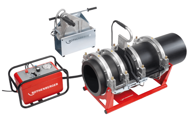 Para utilizá-las em valas, obras e oficinas. Unidade básica: 4 mordentes principais (35 mmØ), quadro de assento de aço tubular, unidade hidráulica e mangueiras de alta pressão de 2,5m (com acoplamento rápido), dois jogos completos de insertos adaptadores de mordentes de 90-110-125-140-160-180-200-225-250-280-315 mmØ, unidade de faceamento elétrica, placa aquecedora controlada eletronicamente, quadro suporte para faceadora e placa aquecedora, ferramentas de montagem.